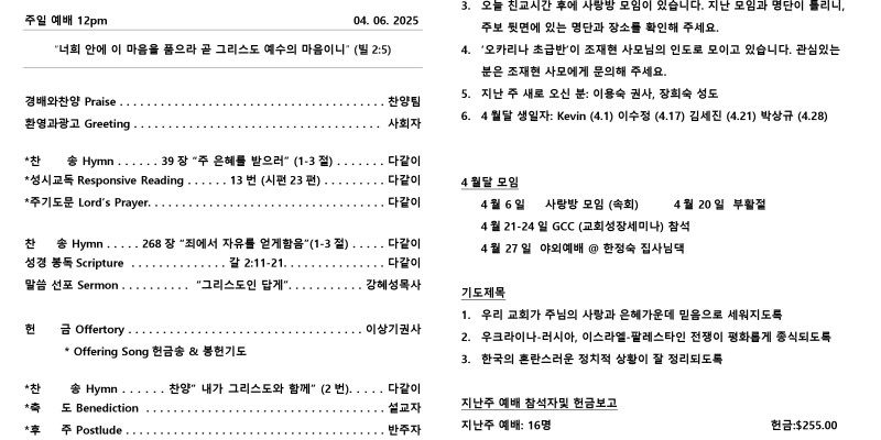 2025년 4월 6일 교회주보 페이지 정보 작성자 : CrownMinistry 작성일 : 2024-11-01 조회수 : 232 목록 본문 2025년 4월 6일 교회주보 이전글2025년 6월 1일 주일 주보 25.06.02 LIST
